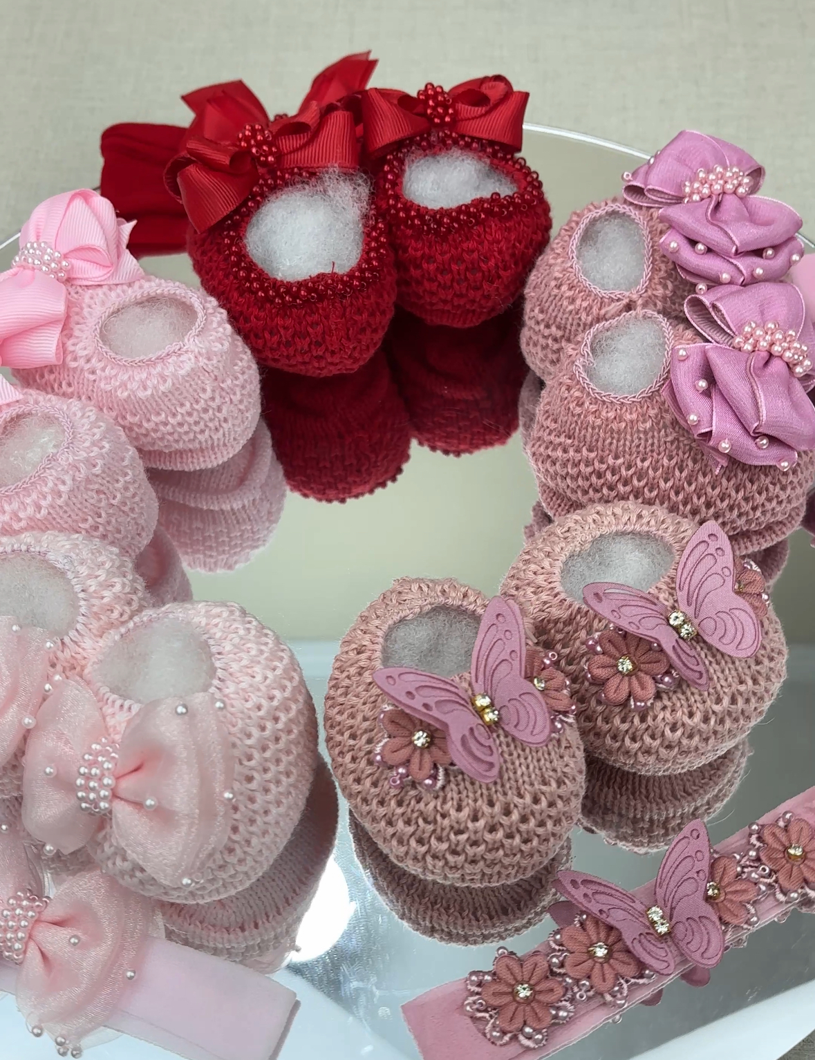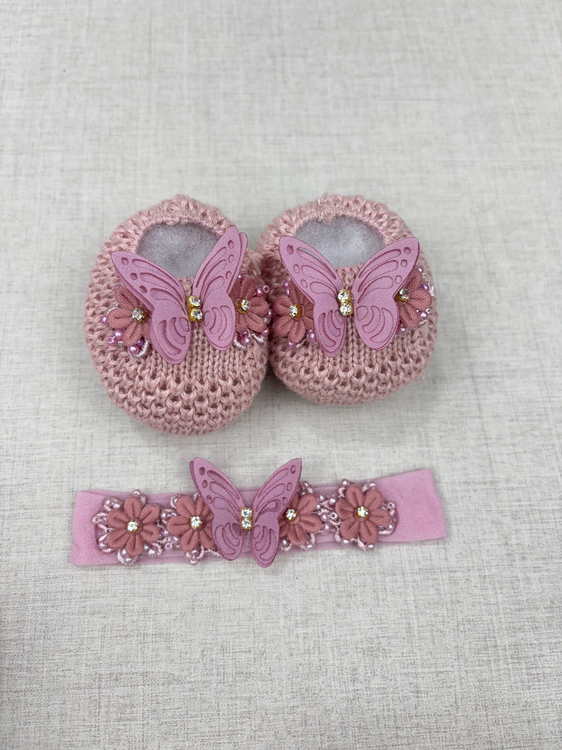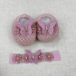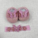 Encante-se com a delicadeza do nosso kit sapatinho de bebê luxo com faixinha de cabelo, desenvolvido artesanalmente para completar o enxoval da sua princesa com elegância e conforto.