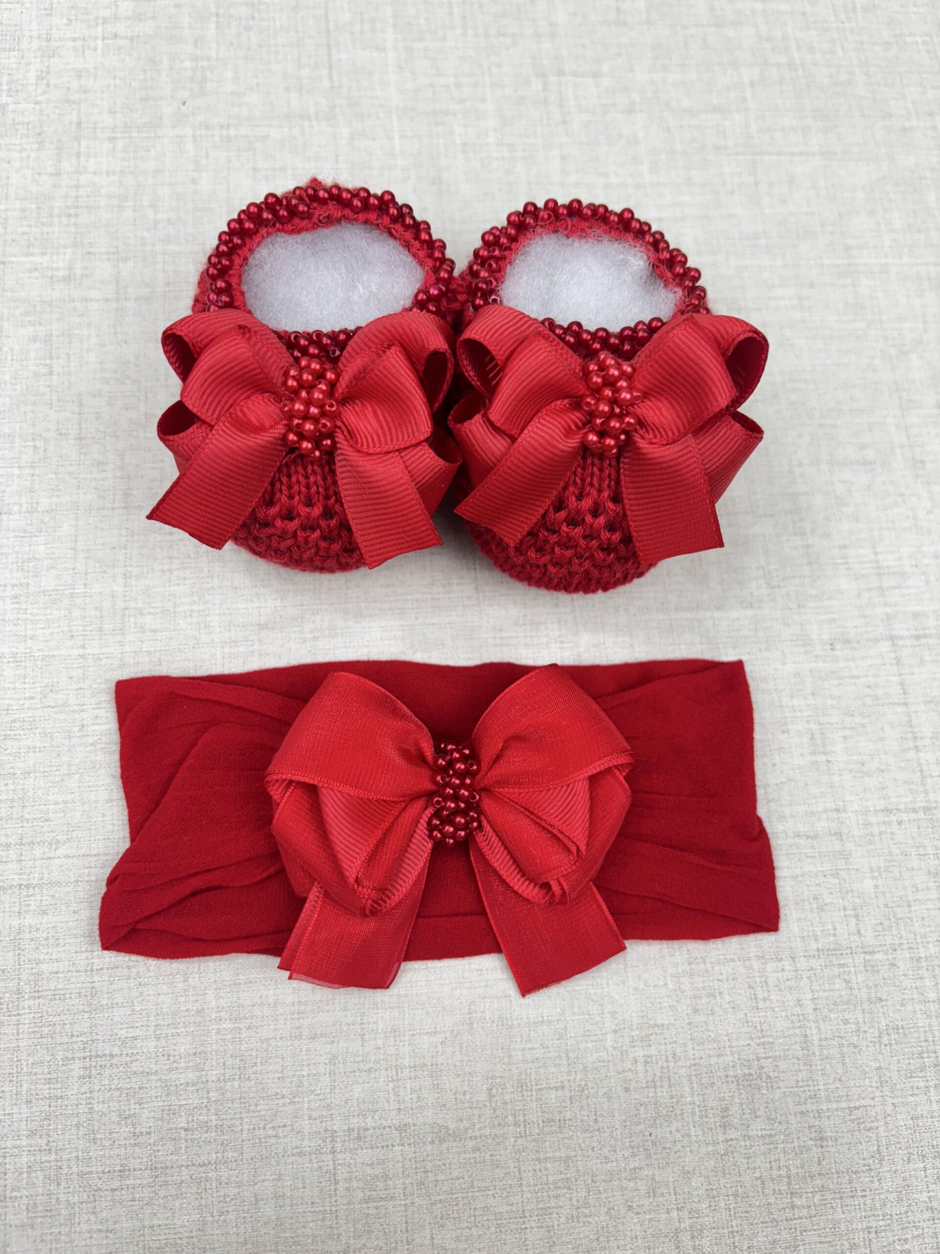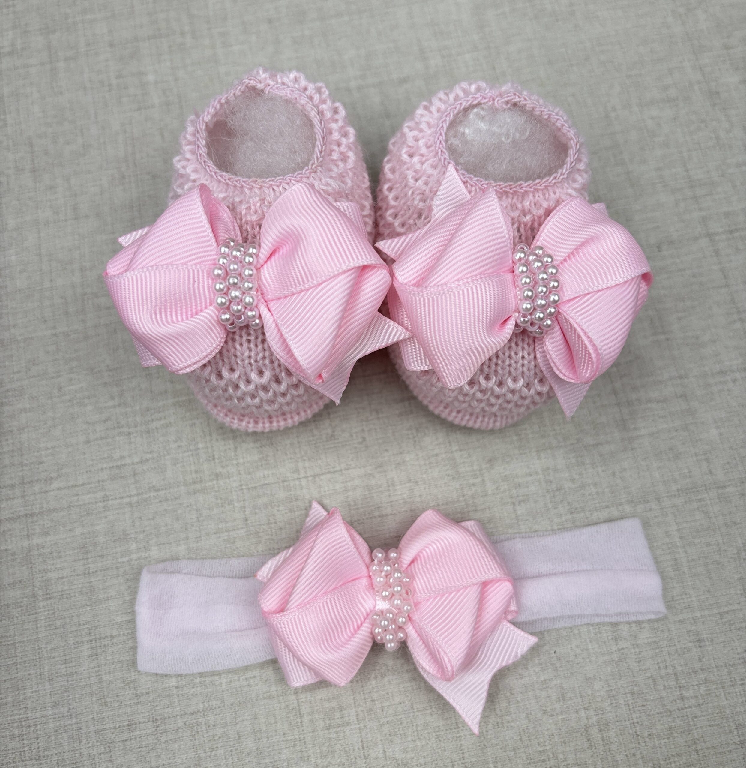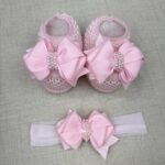 🎀 Faixinha de cabelo para bebê – combinando com o sapatinho, com laço sofisticado e acabamento em pérolas.