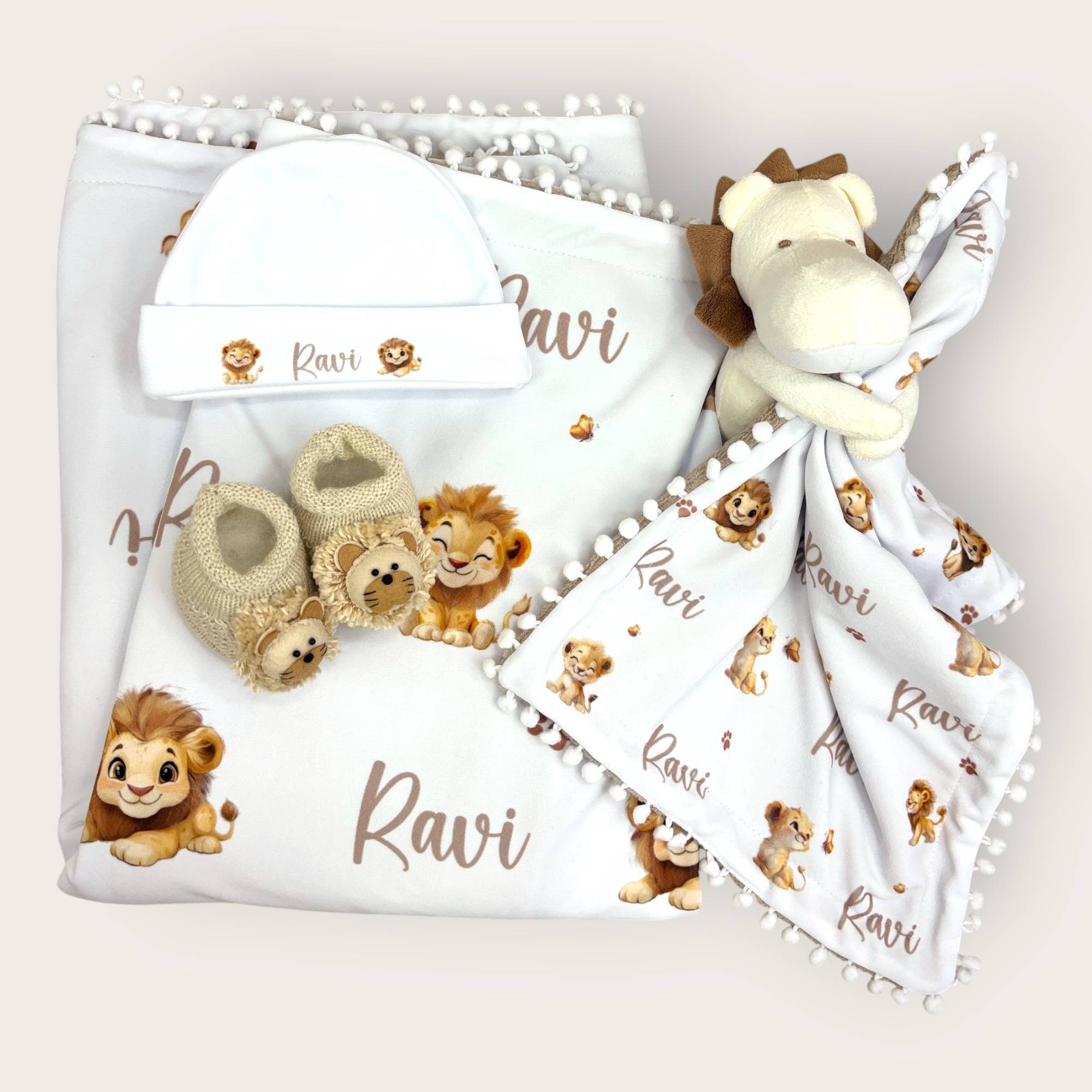 Kit Presente Personalizado – Manta Plush, Naninha, Touca e Sapatinho Tricô Personalizado