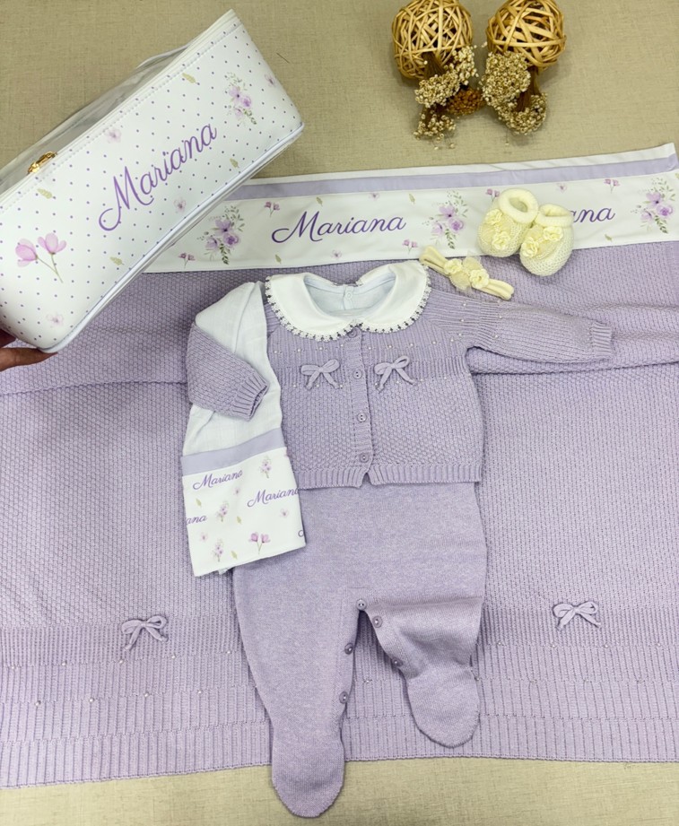 Confeccionada em tricô premium, na delicada cor lavanda, essa saída maternidade encanta pelos detalhes sutis e acabamento impecável.